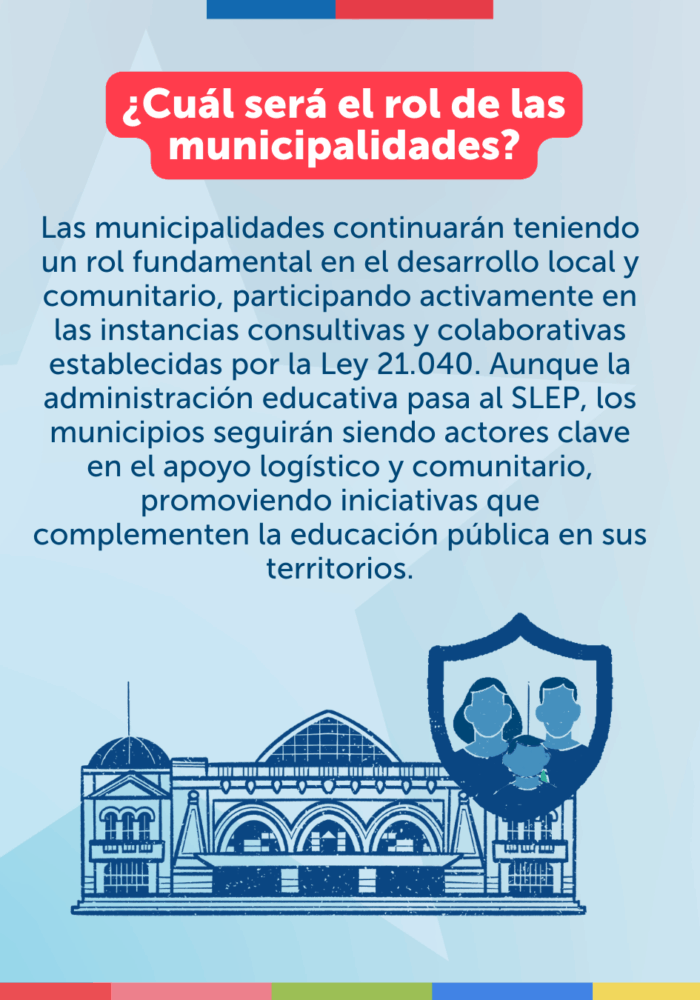 No existe una relación de dependencia con las municipalidades, pero sí de colaboración. Por ejemplo, se podrán celebrar convenios que busquen ayudar a las comunidades educativas.